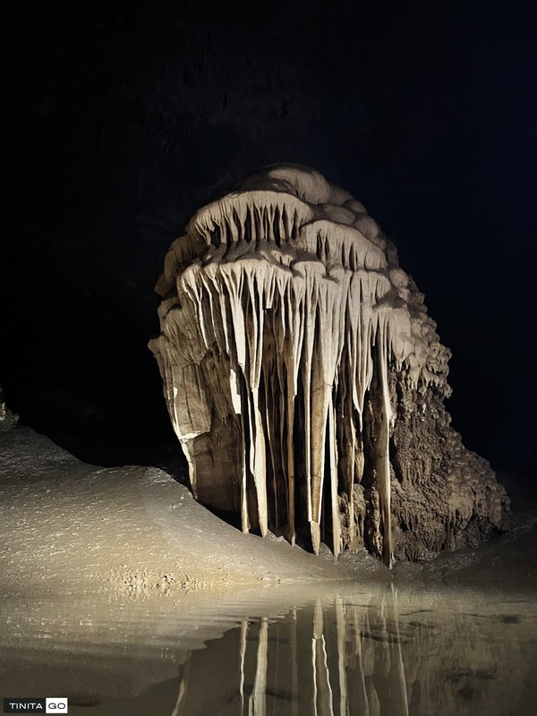 Đèn công suất lớn đặt ở chân thạch nhũ để chụp được ảnh thạch nhũ in bóng xuống nước, trong ảnh là anh em đang tác nghiệp chụp thạch nhũ (hoặc đang chụp con gì đó bơi trong nước)